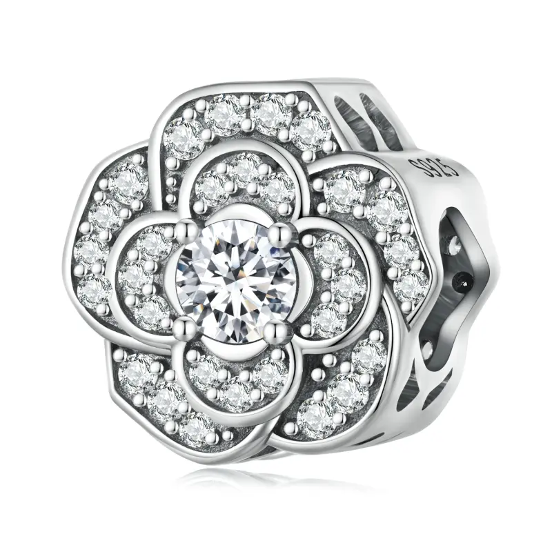 De Pandora Style Camellia-bedel - SCC2493, een oogverblindende toevoeging aan je charmecollectie. Genesteld tussen lagen delicate bloemblaadjes straalt een schitterende ronde zirkonia een stralende gloed uit. De ontluikende cameliabloem symboliseert zuiverheid en perfectie en straalt op elk moment een betoverende allure uit. Deze bedel is vervaardigd met nauwgezette aandacht voor detail en past naadloos bij uw armband in Pandora-stijl, waardoor een vleugje elegantie en verfijning aan uw ensemble wordt toegevoegd. Til je stijl naar een hoger niveau en omarm de fascinerende essentie van de Camellia-bedel – SCC2493.