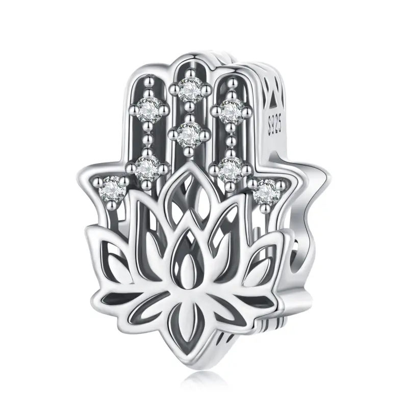 De prachtige Pandora Style Hand van Fatima-bedel - SCC2628! Deze bedel combineert op prachtige wijze het symbool van de Hand van Fatima met een delicate lotusbloem, waardoor een prachtig en betekenisvol accessoire ontstaat. Deze bedel is vervaardigd met een ingewikkeld hol ontwerp en versierd met delicate sprankelende zirkoniastenen, die een vleugje elegantie en schittering toevoegen aan uw sieradencollectie. De hand van Fatima, ook bekend als de Hamsa, is een krachtig symbool waarvan wordt aangenomen dat het de drager geluk, bescherming en zegeningen brengt. Deze bedel dient als een constante herinnering aan positieve energie en spirituele begeleiding, waardoor het een perfect accessoire is voor mensen die op zoek zijn naar een vleugje spiritualiteit in hun leven. Deze bedel is gemaakt van hoogwaardige materialen en is duurzaam en gaat lang mee, waardoor het jarenlang een geliefd stuk zal zijn. Dankzij het veelzijdige ontwerp kan hij aan een armband of ketting worden gedragen, waardoor je de vrijheid hebt om je eigen unieke stijl te creëren. Voeg een vleugje geluk en bescherming toe aan je sieradencollectie met de Pandora Style Hand van Fatima-bedel - SCC2628. Omarm de schoonheid, betekenis en de positieve energie die het in je leven brengt.