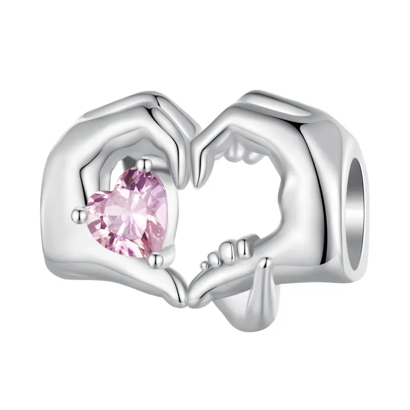 De Pandora Style Heart Gesture-bedel - BSC829, een prachtig accessoire dat de tedere band tussen moeder en kind vastlegt. Deze bedel toont prachtig een kleine hand die de handen van de moeder vasthoudt en een mooi hartvormig duim omhoog gebaar vormt. De bedel is op elegante wijze verfraaid met sprankelende roze zirkoniastenen, die een vleugje glamour toevoegen aan het hartverwarmende ontwerp. Deze bedel is vervaardigd met nauwgezette aandacht voor detail en gemaakt van hoogwaardige materialen die duurzaamheid en een lange levensduur garanderen. De zilverkleurige afwerking voegt een vleugje elegantie en veelzijdigheid toe, waardoor hij moeiteloos bij elke armband of ketting past. Deze bedel in Pandora-stijl dient niet alleen als modieus accessoire, maar heeft ook een diepe betekenis. Het symboliseert de onvoorwaardelijke liefde en genegenheid die wordt gedeeld tussen moeder en kind, waardoor het een oprecht cadeau is voor verjaardagen, Moederdag of een speciale gelegenheid. Voeg een vleugje warmte en zoetheid toe aan je sieradencollectie met de Pandora Style Heart Gesture Charm - BSC829. Omarm de schoonheid van de liefde en koester de kostbare momenten met deze betoverende bedel.