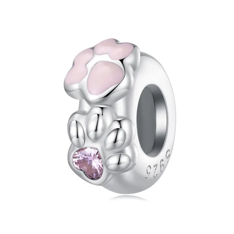 De Pandora Style Cat Claw siliconen afstandhouder - SCC2515, een charmant accessoire dat kattenliefhebbers overal zal boeien. Deze spacer is ontworpen met nauwgezette aandacht voor detail en toont het voortreffelijke vakmanschap van kattenklauwen, versierd met fonkelende stenen en druppelachtige accenten. De levensechte textuur roept een gevoel van authenticiteit op, waardoor je de klauwen onder je vingertoppen kunt voelen. Met een zacht vleugje roze voegt deze speelse spacer een vleugje schattigheid toe aan elke Pandora-armband en laat harten smelten met zijn onweerstaanbare charme. Ervaar het plezier van het omarmen van je liefde voor katten met dit schattige accessoire.