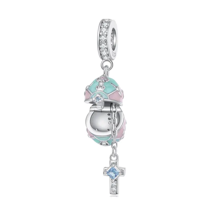 De Pandora Style Easter Egg Dangle - BSC779, het perfecte accessoire om een vleugje eigenzinnigheid en elegantie toe te voegen aan je sieradencollectie. Deze prachtige bedel heeft een vintage patroon gecombineerd met een kruis, dat een nieuw begin en de voortzetting van het leven symboliseert. De betoverende tinten roze en groen in het oliedruppelontwerp maken deze bungel opvallend en leuk. Het unieke, te openen ontwerp voegt een speels element toe, waardoor je de verborgen schatten erin kunt onthullen. Deze paasei-bedel is gemaakt met aandacht voor detail en is gemaakt om lang mee te gaan. Verbeter je stijl en vier de schoonheid van het leven met de Pandora Style Easter Egg Dangle - BSC779.