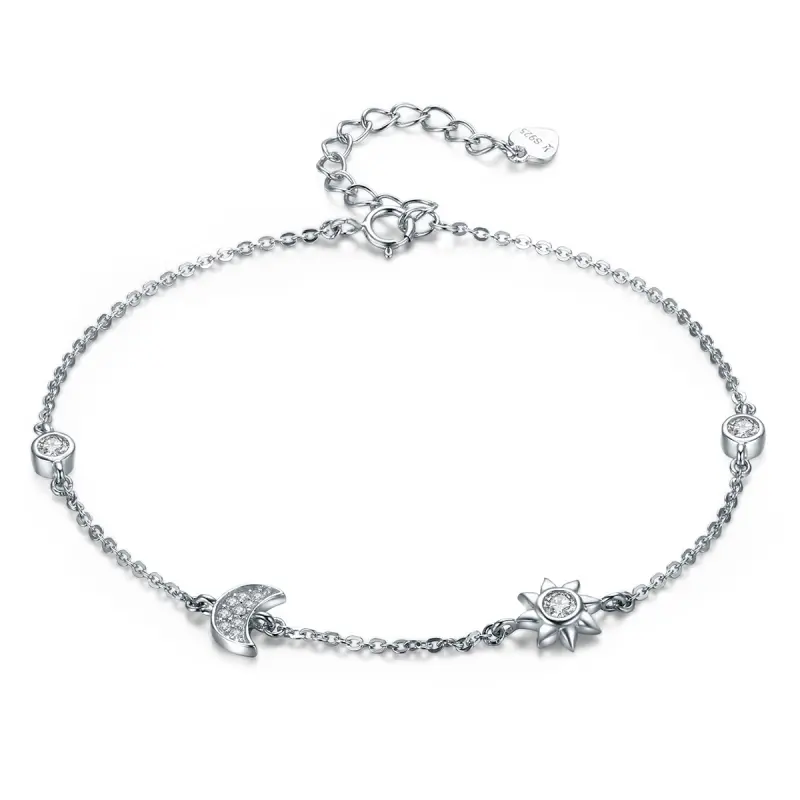De Pandora Style Silver Moon Sun and Stars Chain Slider-armband - SCB081, een hemels geïnspireerd accessoire dat een vleugje betovering zal toevoegen aan je dagelijkse stijl. Deze armband is gemaakt met precisie en oog voor detail en is een must-have voor iedereen die de schoonheid van de nachtelijke hemel waardeert. Deze armband heeft een delicaat kettingschuifontwerp en is verstelbaar voor elke polsmaat, waardoor een comfortabele en veilige pasvorm wordt gegarandeerd. Het middelpunt van dit stuk is een boeiende combinatie van een zilveren maan, zon en sterren, prachtig gerangschikt om een betoverend hemels motief te creëren. Elk element is met de grootste zorg vervaardigd, wat het vakmanschap en de kwaliteit laat zien die deze armband belichaamt. Deze armband is gemaakt van hoogwaardig zilver en straalt niet alleen elegantie uit, maar biedt ook duurzaamheid voor langdurig gebruik. De zilveren afwerking voegt een vleugje verfijning toe, waardoor het het perfecte accessoire is voor elke gelegenheid, of het nu een informeel dagje uit is of een speciaal avondevenement. Deze armband in Pandora-stijl is niet alleen een prachtige toevoeging aan je sieradencollectie, maar ook een betekenisvol symbool van de hemelse wonderen. Het dient als een herinnering om de schoonheid om ons heen te omarmen en altijd naar de sterren te reiken. Til je stijl naar een hoger niveau en laat je innerlijke sterrenkijker schitteren met de Pandora Style zilveren maanzon- en sterrenkettingschuifarmband - SCB081. Pak de jouwe nu en ervaar de magie van de nachtelijke hemel om je pols.